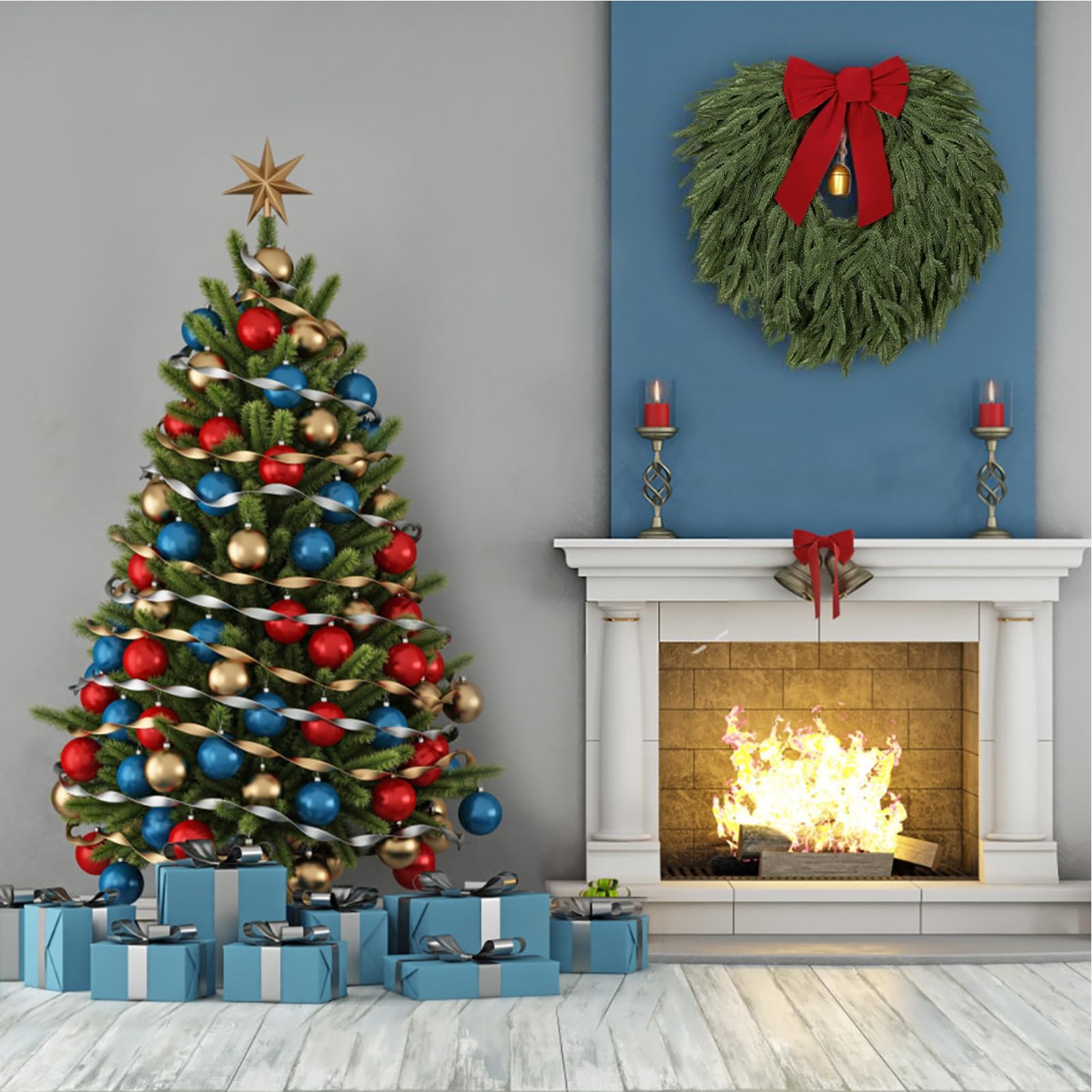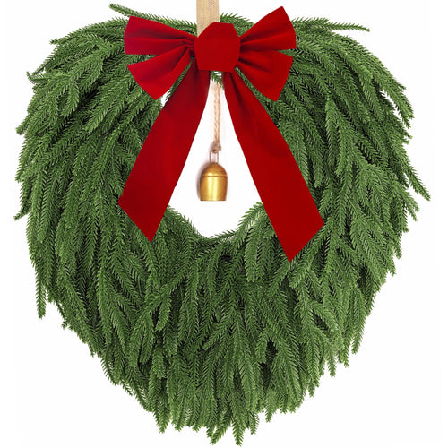 24" Norfolk Pine Wreath, Artificial Christmas Wreaths, Real Touch Green Winter Garland for Front Door Wall Indoor Outdoor Christmas Holiday Decor, with Bow & Bell, FF12
